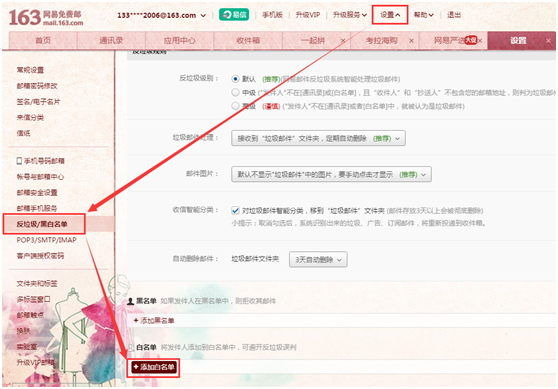 依次點擊“設(shè)置”—“反垃圾/黑名單”—“添加白名單”;