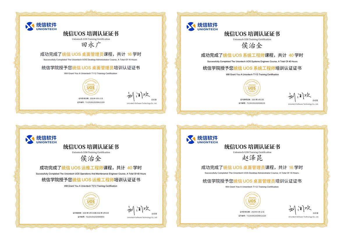 ? ? ? ? 為了提升對(duì)統(tǒng)信UOS的管理、應(yīng)用、運(yùn)維等技術(shù)能力,應(yīng)對(duì)因外部環(huán)境變化導(dǎo)致的客戶需求變化,8月中旬,我公司3名技術(shù)工程師應(yīng)邀參加UOS操作系統(tǒng)認(rèn)證培訓(xùn),在操作系統(tǒng)部署、應(yīng)用開(kāi)發(fā)、系統(tǒng)運(yùn)維、數(shù)據(jù)管理等方面進(jìn)行了深入學(xué)習(xí),并順利通過(guò)了桌面管理員、系統(tǒng)工程師、運(yùn)維工程師等職稱考試,取得了認(rèn)證證書(shū)。